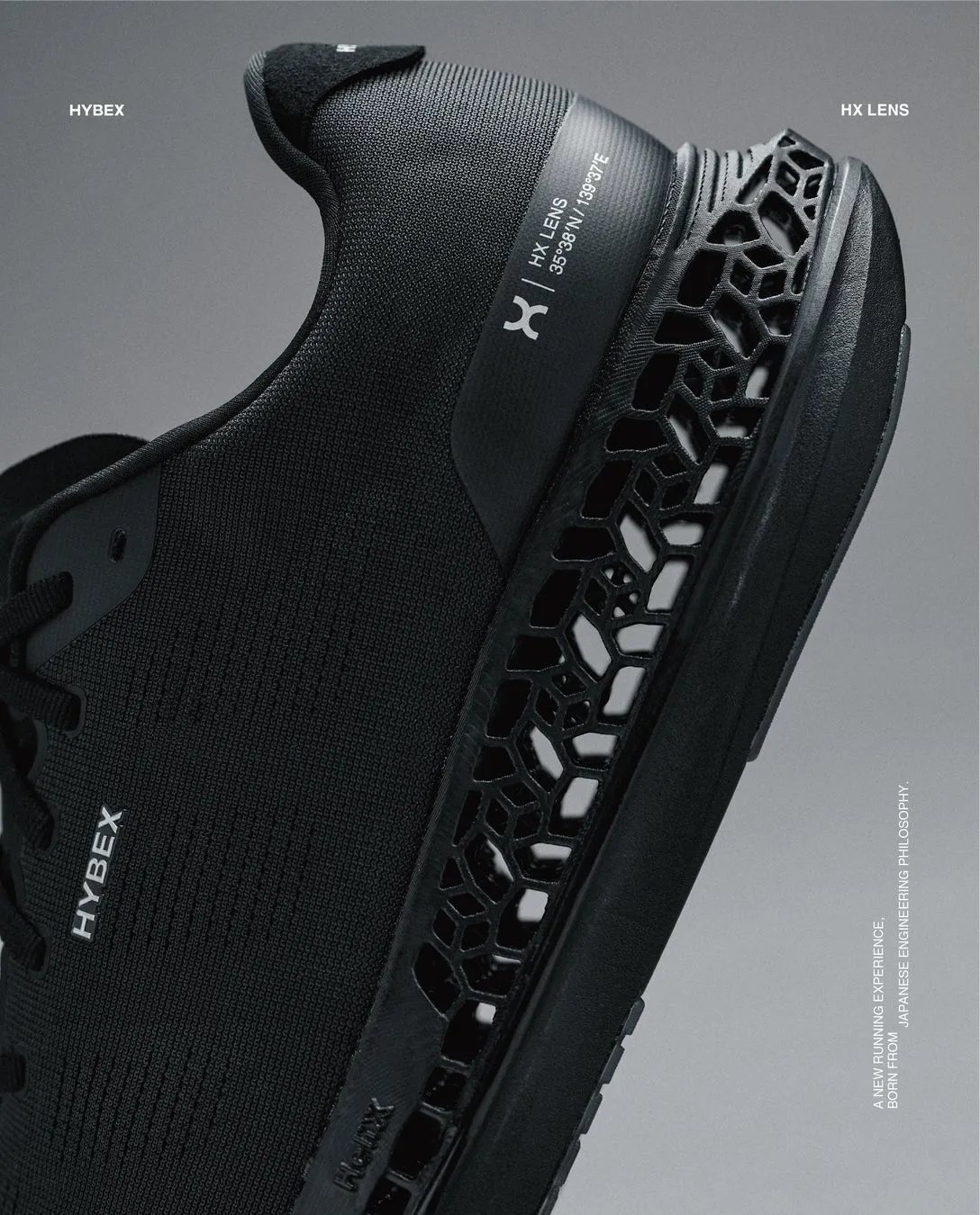 「HX LENS」の核となるのは、HYBEXが特許を取得した独自技術「HeliX™(ヘリックス)ソール」である。一般的なシューズが着地時の衝撃を吸収し、その反発で前へ進むのに対し、HeliX™ソールは着地時の衝撃を吸収しつつ、同時にブレーキ力を低減しながら回転運動によって前方への推進力へと変換する。この「前に回転しながら潰れる」という唯一無二のメカニズムにより、まるで車輪が路面を捉えるように、足元が自然と前へと流れていくような感覚を実現している。