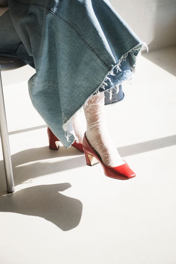 デニムスカートのボリューム感と、少しレトロな赤いヒールシューズとの隙間を華やかに繋ぎながら足元の流れを作ってくれるレースソックスは、シアーで女らしい表情も相まって、デニムにまた新鮮な雰囲気をもたらしてくれます。